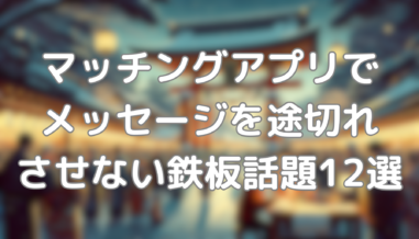 マッチングアプリ解説プロが選ぶマッチングアプリでメッセージを途切れさせない鉄板話題12選 元マッチングアプリ運営者がその経験を活かし、初対面でもスムーズに会話が進む鉄板話題を12個ご紹介します。これらの話題は、新しい出会いを深めるための素晴らしいスタート地点となるでしょう。 初対面でも話しやすい鉄板の話題 相手のプロフィールにつ...マッチングアプリ解説